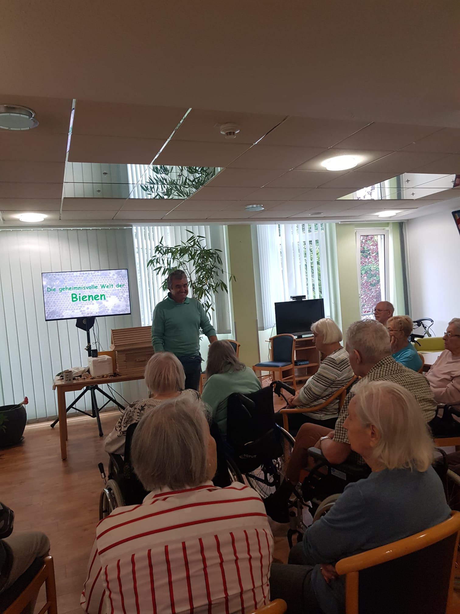 Der Saal war mit erwartungsvoller Atmosphäre gefüllt, als 42 Bewohnerinnen und Bewohner neugierig Platz nahmen, um das Spektakel zu genießen. Die Bienen, die fleißigen kleinen Helden der Natur, wurden von Herrn Trenz mit beeindruckender Leidenschaft und Sachkenntnis präsentiert. Von ihrem faszinierenden Lebenszyklus bis hin zu ihrer Bedeutung für die Umwelt - nichts blieb unentdeckt.