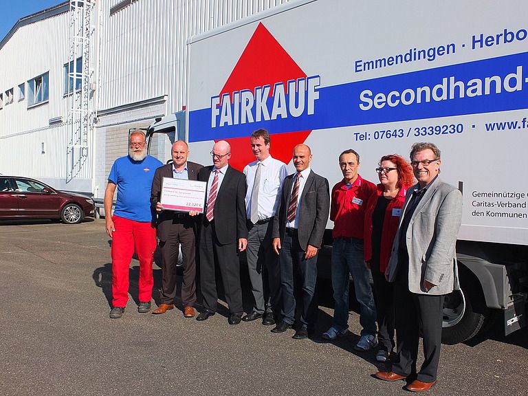 Mit exakt 22.320 Euro aus den Zweckerträgen der GlücksSpirale wurde die Beschäftigung und Qualifizierung von rund 50 ehemals langzeitarbeitslosen Personen im Landkreis Emmendingen ermöglicht – inklusive der Anschaffung eines 7,5-t-LKW für die landkreisweite Abholung von Möbel- und Warenspenden. Den symbolischen Scheck übergab Bodo Schöffel (Lotto-Bezirksdirektion Südlicher Oberrhein) am 23. September 2014 an Oberbürgermeister Stefan Schlatterer (Beiratsvorsitzender 48° Süd). Ebenfalls dabei: Rainer Weingärtner (Caritasverband Emmendingen), Bernhard Schmolck (Mercedes Schmolck) und Patrick Krezdorn (Geschäftsführer 48° Süd).