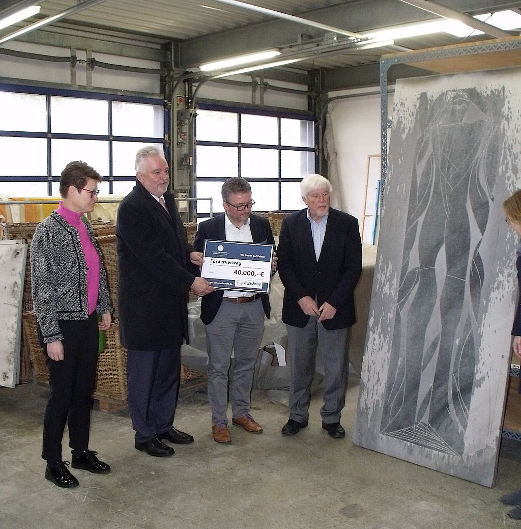 Große Freude in Mössingen (Kreis Tübingen): Die Stoffsammlungen der ehemaligen Textildruckfirma Pausa können auch dank 40.000 Euro aus der Lotterie GlücksSpirale konserviert werden. Lotto-Direktor Norbert Müller und Lotto-Regionaldirektor Hubert Gfrörer überreichten am Freitag (14. Februar) gemeinsam mit Ortskurator Christian Barth von der Deutschen Stiftung Denkmalschutz (DSD) einen symbolischen Förderscheck an Oberbürgermeister Michael Bulander.
