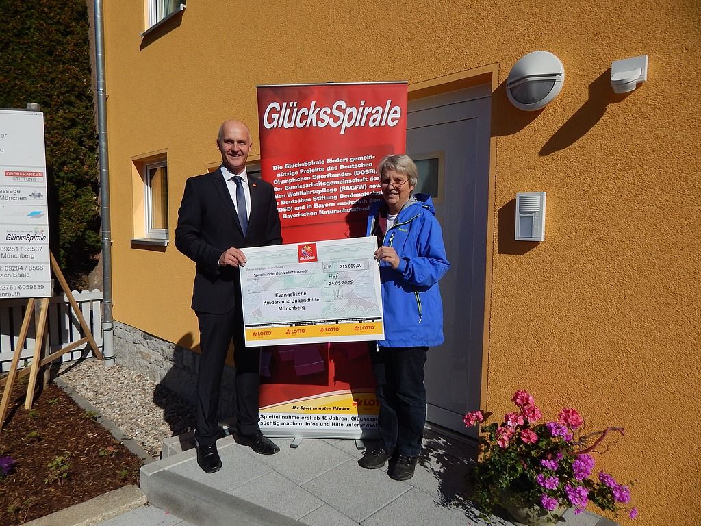 Die Realisierung gelang dank starker Förderpartner: 300.000 Euro kamen von der GlücksSpirale, weitere 215.000 Euro von der Aktion Sternstunden des Bayerischen Rundfunks und 215.000 Euro von der Oberfrankenstiftung; auch die Bayerische Landesstiftung beteiligte sich. Damit konnte das frühere Gebäude bis auf den Keller abgebrochen, neu gebaut und erweitert werden – inklusive neuem Garten. Bei der Feier dabei: u. a. Ulrich Krückel (LOTTO Bayern), Dr. Kathrin Degmair (BR), Sabine Kerner (Regierung von Oberfranken), Gerhard Zeitler (Kreisjugendamt Hof), Architekt Dietrich Scheler sowie Renate Müller (Leiterin Kinderheim Münchberg).