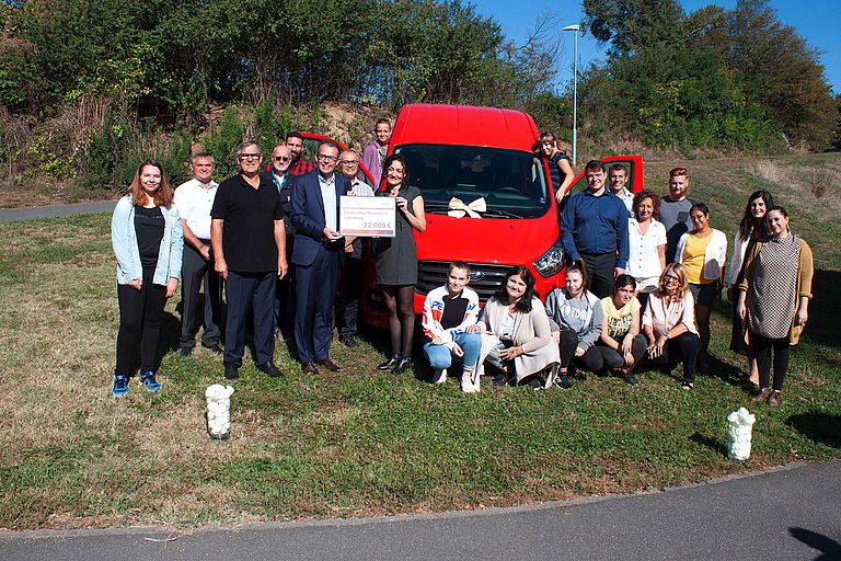 Die GlücksSpirale förderte mit 22.000 Euro die Anschaffung des Fahrzeugs. Den symbolischen Scheck überreichte Georg Wacker (Lotto-Geschäftsführer) am Mittwoch, 4. September an Silke Oertelt (Leiterin Haus Mirabelle). Vor Ort waren außerdem Silke Tempel (pädagogischer Fachdienst), Julia Laumann (übergeordnete Koordinatorin) und Marianne Fath (Verwaltungsleiterin).