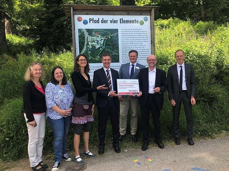 Die GlücksSpirale stellte fünfzigtausend Euro bereit. Den symbolischen Scheck überreichte Lotto-Regionaldirektor Bodo Schöffel am 27. Juni 2018 an Andreas Jeger, Vorstand der Stiftung Caritas-Haus Feldberg. Mit dabei: Susanne Hartmann (Gesellschaftervertreterin des Diözesan-Caritasverbands Freiburg), Udo Wankelmuth (Geschäftsführer ITZ Caritas-Haus Feldberg gGmbH) und Dr. med. Hansjörg Schmelzle (Chefarzt). Die Mittel ermöglichten die Umsetzung des gesamten Erlebnisrundwegs.